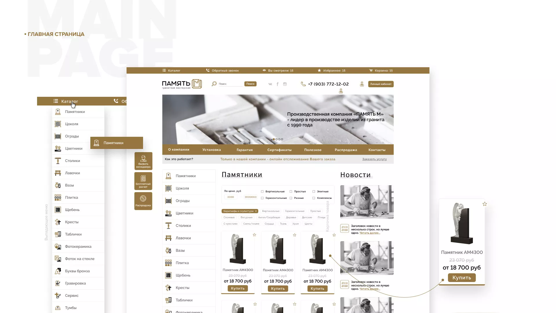 Разработка логотипа, фирменного стиля и сайта в Тутаеве для компании «Память-М». Компания является предприятием по изготовлению всех видов надгробных сооружений: памятников, цоколей на могилу, оградок, столов, лавочек, ваз, балясин, плитки, мемориальных комплексов. Компании «Память-М» изготавливает все виды мемориальных изделий на собственном производстве в Тутаеве.